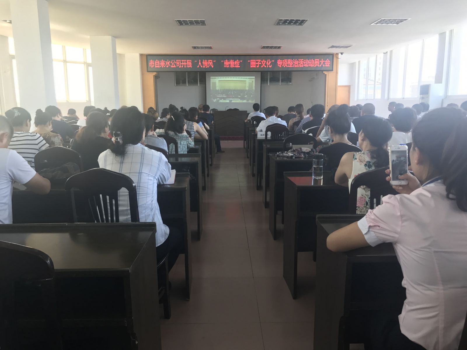 供水leyu·乐鱼(中国)体育官方网站市自来水公司召开“人情风”“庸懒症”“圈子文化”专项整治活动动员大会7月21日下午,市自来水公司召开了开展“人情风”“庸懒症”“圈子文化”专项整治活动动员大会,公司全体职工干部参加了会议。 会上,集中观看了专题片;公司副经理黄杰领学了市纪委三个《通报》;公司副经理卢拥军领学了《市自来水公司开展“人情风”“庸懒症”“圈子文化”专项整治活动实施方案》。 公司经理黄万斌在会上作了主题报告。他分析了公司在“人情风”“庸懒症”“圈子文化”方面存在的突出问题,他强调,公司要采取切实可行的措施,煞住“人情风”,对症下药治庸懒,遏制“圈子文化”。他要求全体干部职工要对照纪律要求,检查自己的言行,全面配合公司抓好专项整治活动,深入推进公司的作风建设。