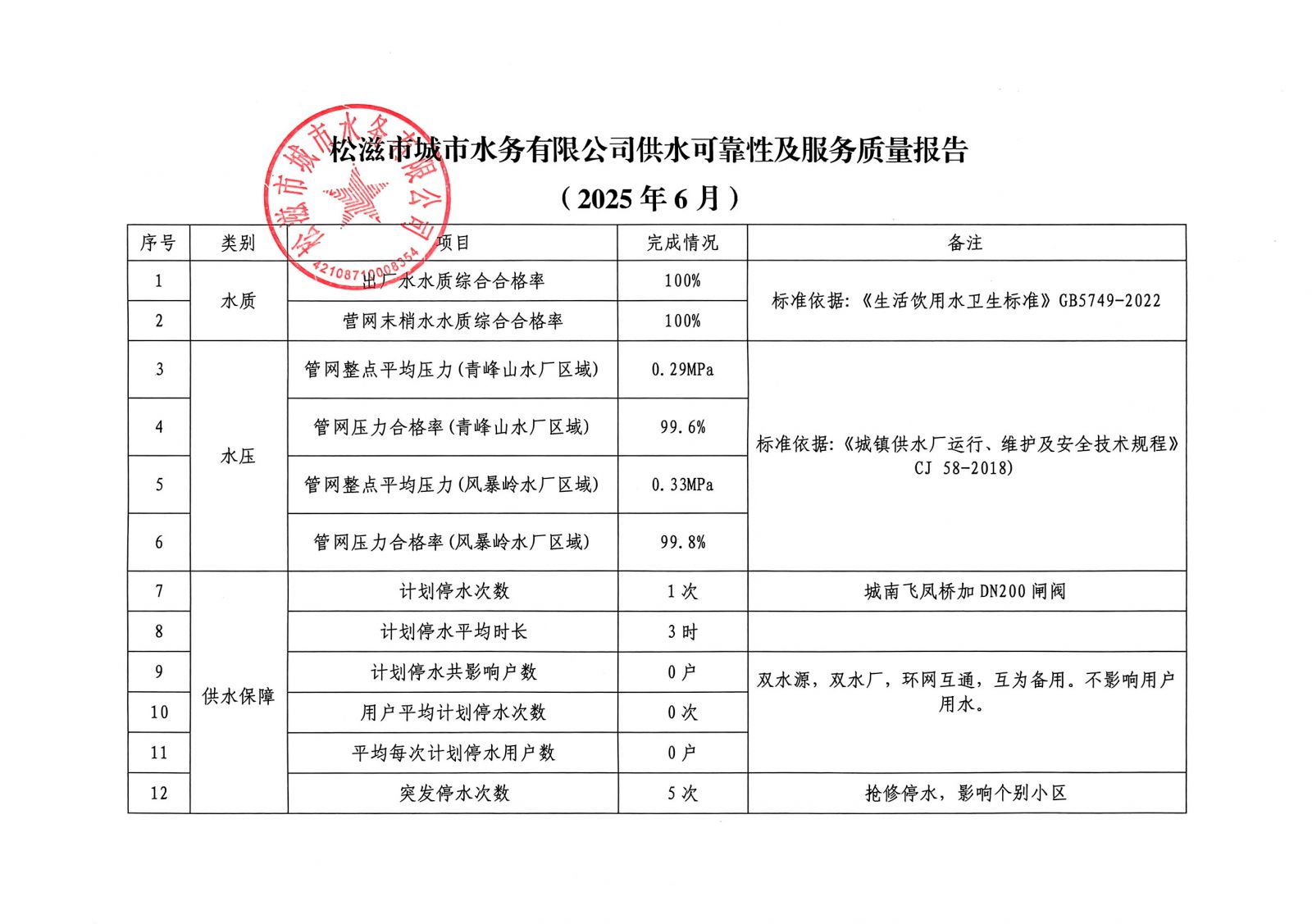 松滋市城市水务有限公司供水可靠性及服务质量报告(2025年6月)