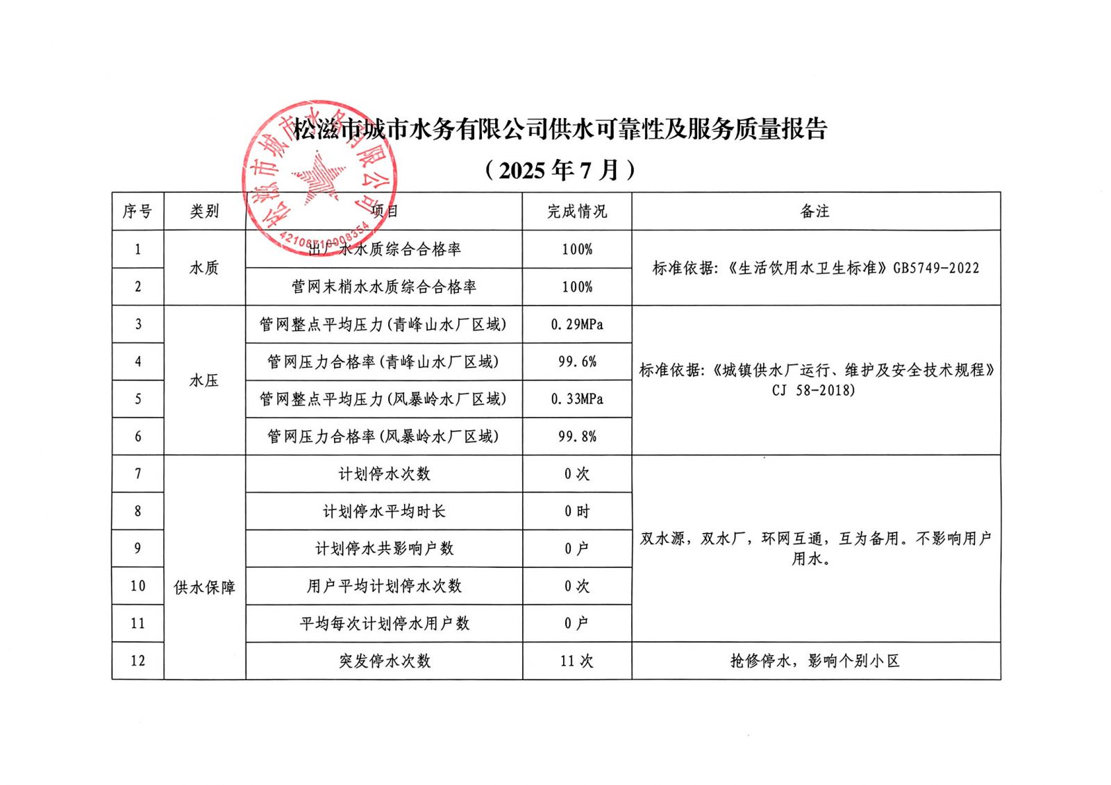 松滋市城市水务有限公司供水可靠性及服务质量报告(2025年7月)