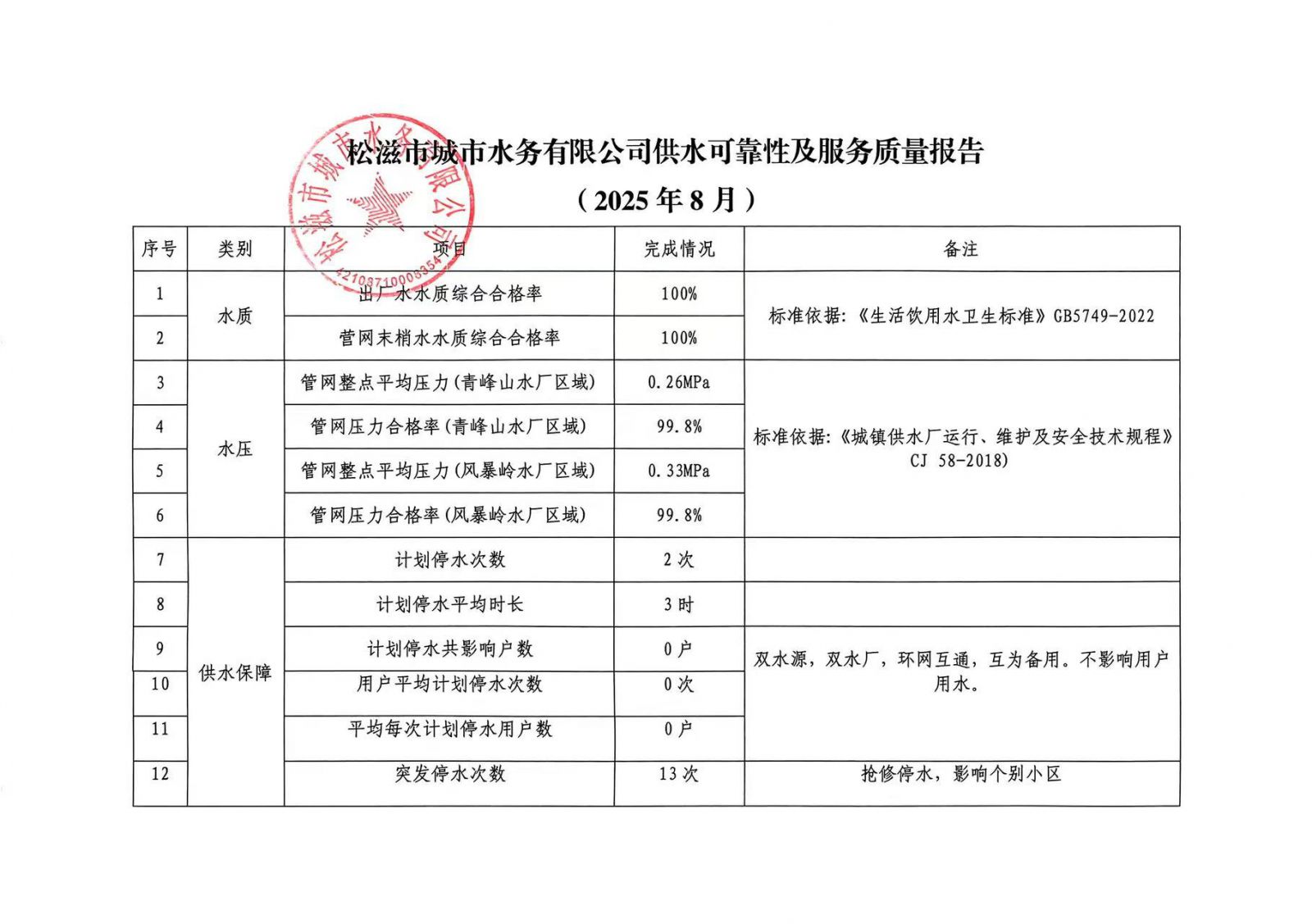 松滋市城市水务有限公司供水可靠性及服务质量报告(2025年8月)