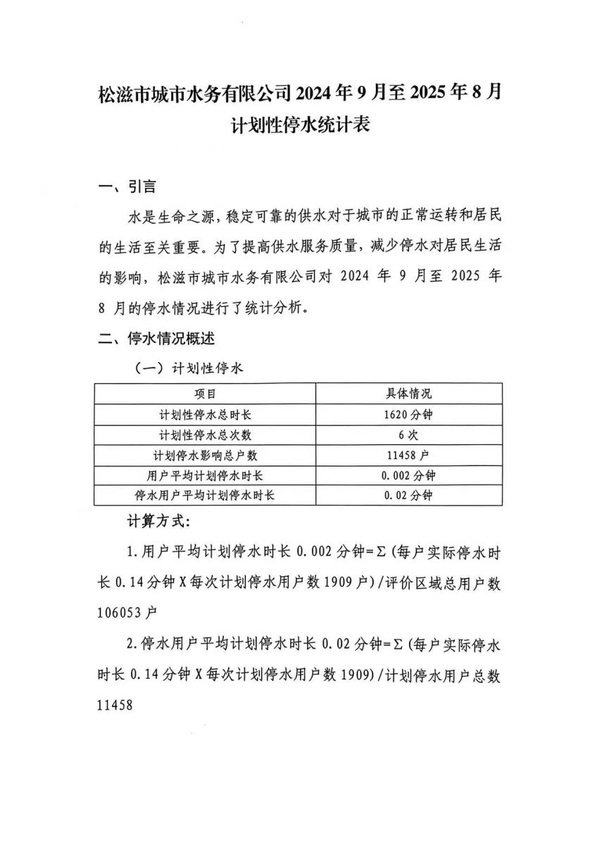 松滋市城市水务有限公司供水可靠性及服务质量报告 (2025年9月)