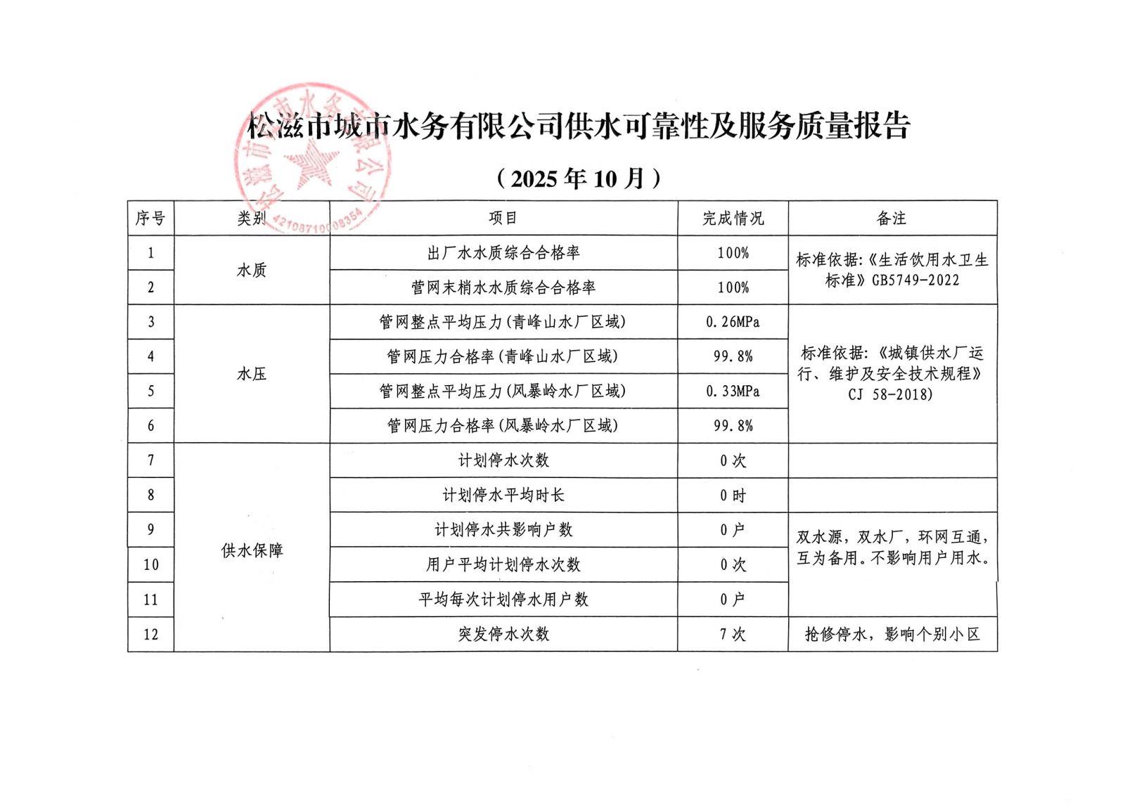 松滋市城市水务有限公司供水可靠性及服务质量报告 (2025年10月)